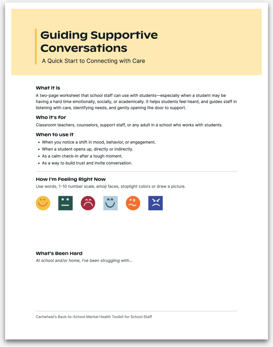 A two-page worksheet that school staff can use with students—especially when a student may be having a hard time emotionally, socially, or academically.